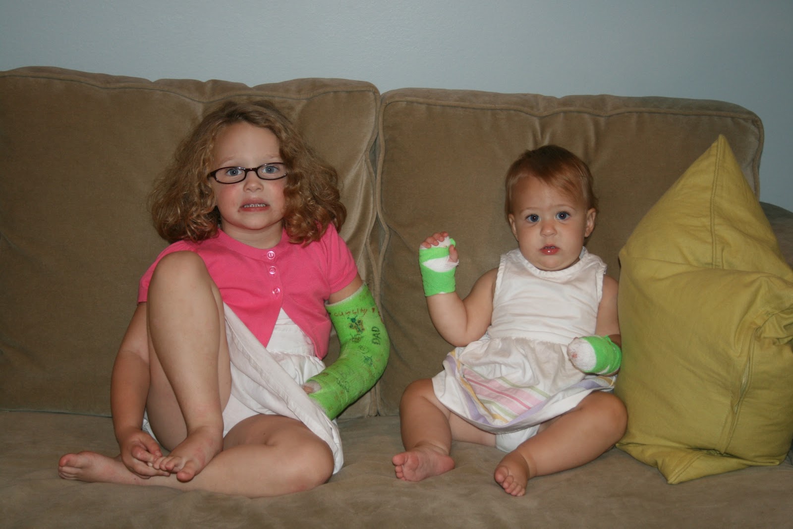 | It happened the night before Macy got her cast off. The nurse bandaging her happened to pick matching bandages. So they were twins for the night. I was afraid instacare would call child services. |